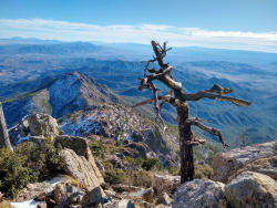 As I recall, the final portion of the trail to “the peak” (the place where you get to sign your name in a notebook, date the event, and place the notebook back into the metal ammo box in which it resides) was covered with large rocks, and cumbersome. But the view from the peak (9,456 feet) was awesome, allowing you to see into Mexico as well as much of Southern Arizona.