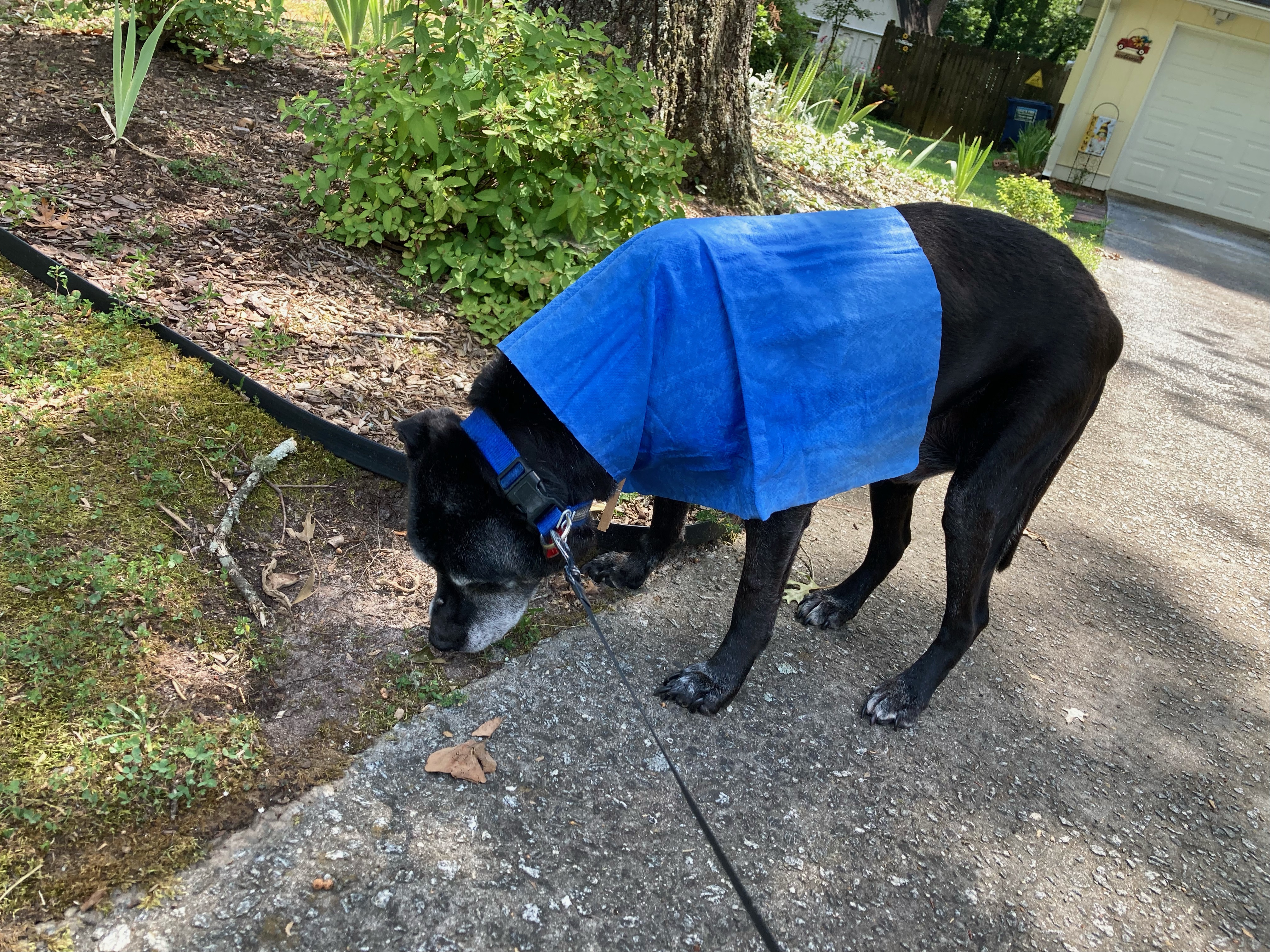 Our daily afternoon walks (which he entered the room and announced without fail) began to diminish in duration as his back left leg began to fail him, and a couple of instances of overheating made us adorn him with “the blue cape,” a cool water-retaining rag held on with a clothes pin when we walked in the warmer months. A few months ago the walks ended altogether, and we would let him out in the front yard to “do his business” and to do what I finally realized was “grass watching” (the way some people “bird watch”). His inability to handle steps had long before stopped his going down off the back deck into the backyard. Eventually he completely stopped going out on the back deck at all.