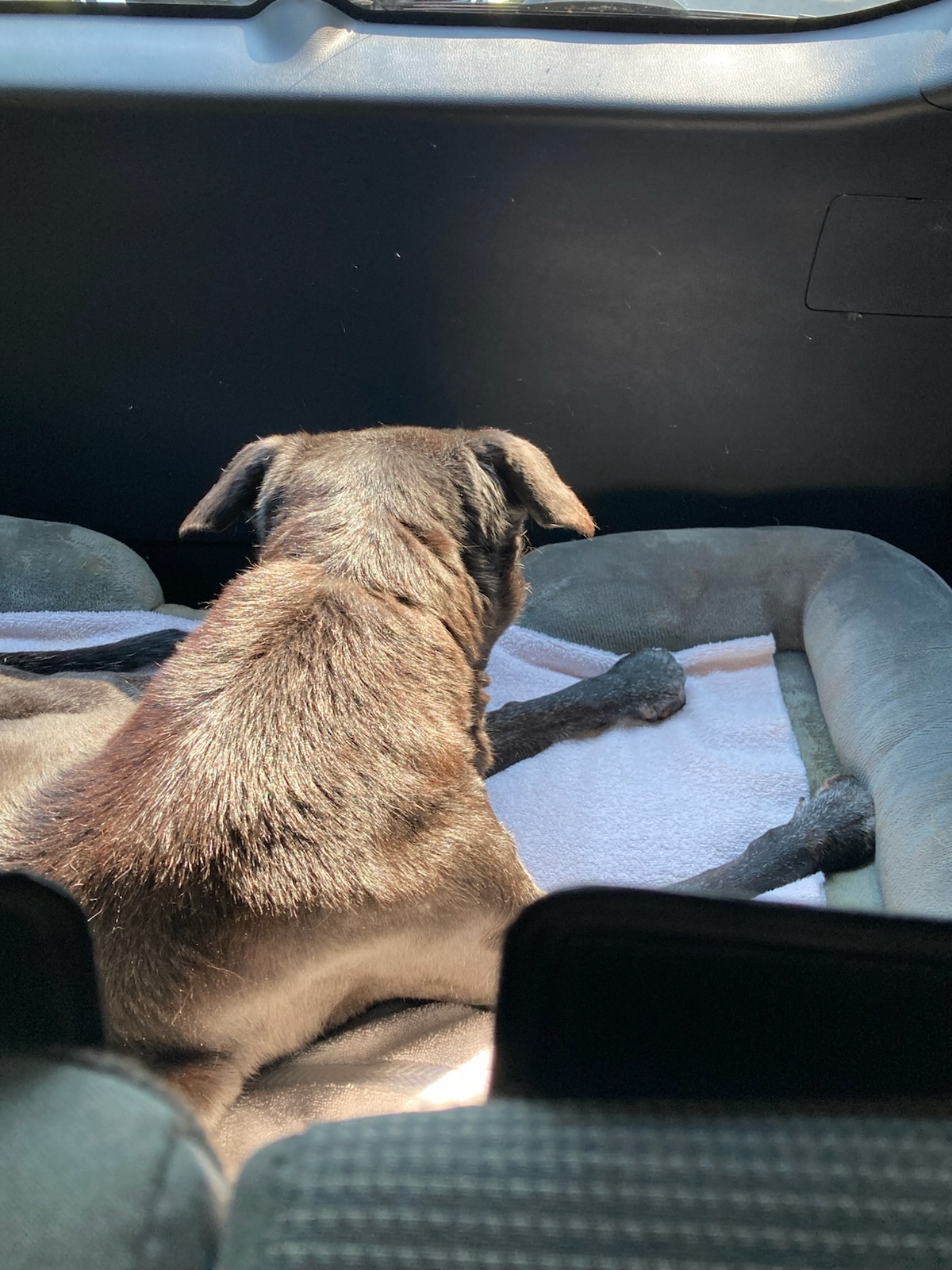The clock moved ever so slowly that day for us all . . . until the last hour; at that point it seemed to speed up tremendously. We took him out to the car, placed him on his bed in the back and drove to the vet minutes away. The sunlight on his final car ride was like a glowing blanket engulfing him. Once we were inside we stroked his hair gently, and watched as he was given a fast acting sedative with ketamine to calm him, then he was given the slow fatal dose of pentobarbital. The goneness was palpable. But he died in peace . . . in his own bed.